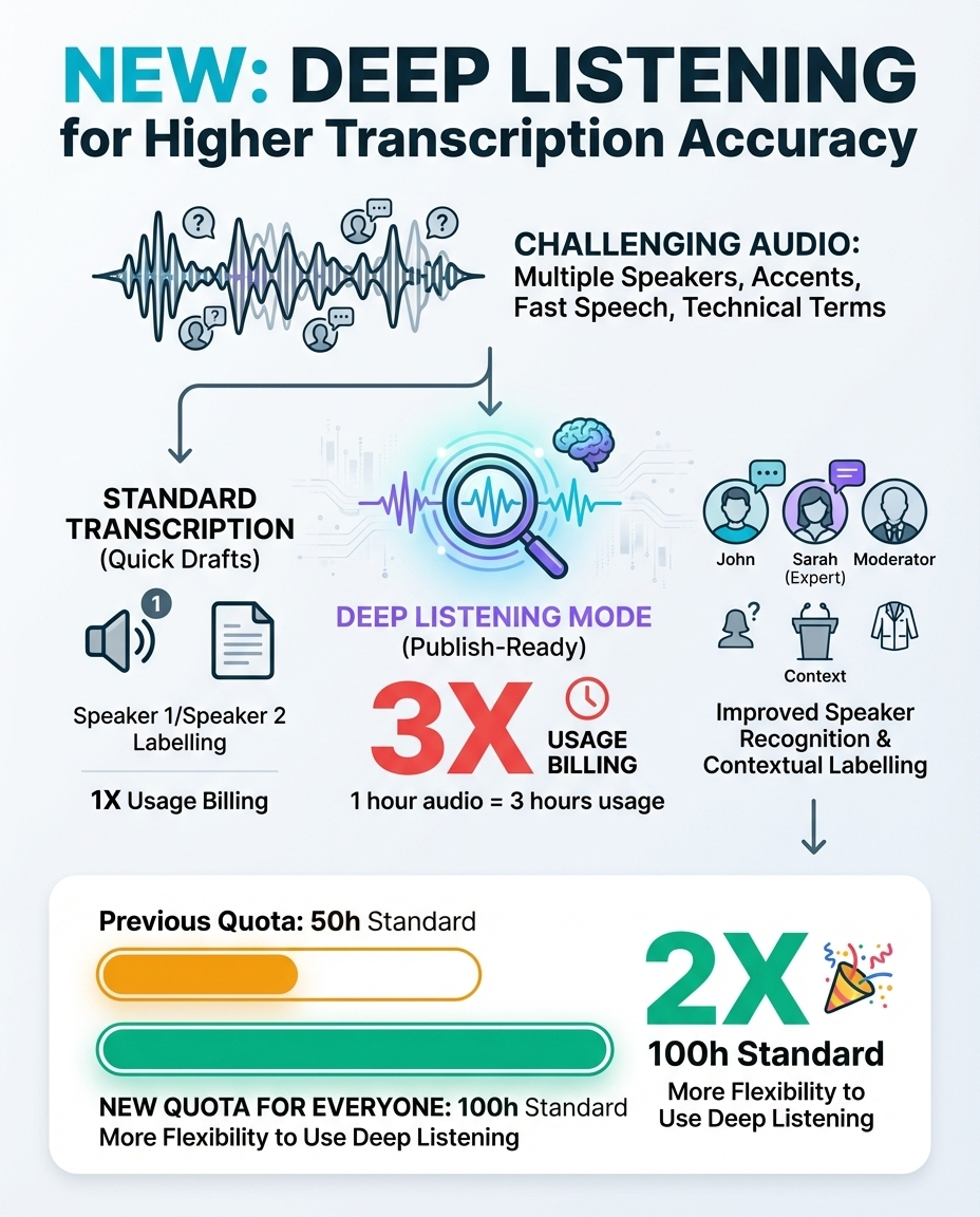 Deep Listening is built for accuracy, so it may take longer than standard transcription. That’s intentional - we use multiple models and multi-pass to make it more precise. For everyday notes and clean audio, standard transcription is usually enough. But when accuracy truly matters, Deep Listening gives you an extra level of confidence.